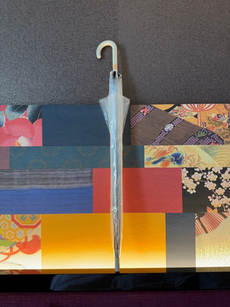 Le deuxième protège de la pluie, il est grand, confortable à porter et il résiste au vent. De plus, il est transparent, et quand il pleut on peut observer le ciel et les paysages comme par la fenêtre. Mais sa tige est tellement longue, qu’il faut un véritable engagement moral et physique pour décider de le prendre avec soi si on n’est pas certain qu’il va pleuvoir – et pendant la saison de pluie on n’est jamais trop certain. De plus, vu sa taille, quand on entre à l’intérieur de divers établissements (à l’exception des hôtels où on l’amène dans notre chambre), on doit le laisser dans un porte-parapluie à l’entrée. Mais les parapluies, ça se vole! Surtout ceux qui sont transparents. Car 1) ils se ressemblent tous, et 2) apparement, s’approprier un parapluie c’est un peu un sport national ici.