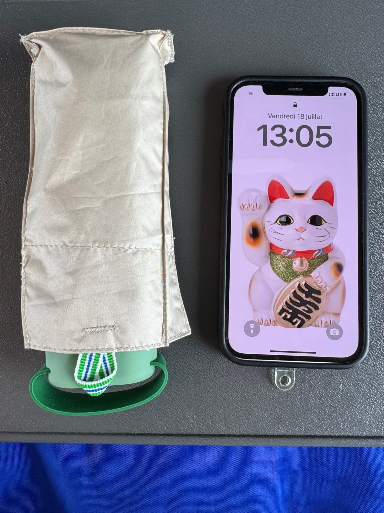 À Tokyo, nous avons acquis deux parapluies. Les deux ont leurs forces et leurs failles. Le premier protège du soleil, des rayons UV et de la pluie. Il est petit et confortable à transporter dans le sac. Mais, à la fois, il est un peu fragile face au vent et inconfortable à porter dans la main: il n’a pas de véritable poignée, mais juste une sorte de bout de 1 cm d’épaisseur, et sa tige est tellement courte que la main porteuse doit toujours être en l’air, comme celle de Maneki-Neko, le chat porte-bonheur.